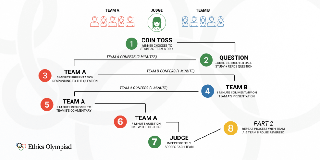 An Ethics Olympiad is a competitive yet collaborative event in which students analyze and discuss real-life, and timely, ethical